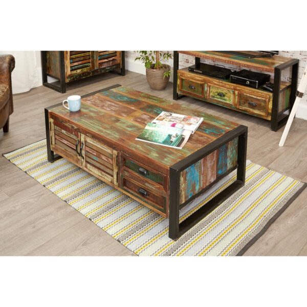 Presenting the contemporary Urban Chic 4 Door 4 Drawers Large Coffee Table, made from a high quality selection of reclaimed wood. Manufactured using salvaged wood from places such as Gujarat, Maharashtra and Rajasthan in Southern India, the Urban Chic range is truly unique. Recycled wood ranging between 50 and 150 years old and carefully assembled by skilled craftsmen, resulting in a colourful and interesting furniture design.